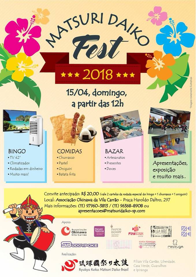 Reserve o dia 15 de Abril para participar do Matsuri Daiko Fest 2018, uma data repleta de comidas, bingo e bazar, tudo com a companhia do Ryukyu Koku Matsuri Daiko, os famosos tambores de Okinawa.