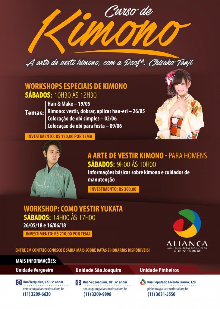O Centro Cultural Aliança inicia em maio os workshops especiais do curso “Kimono – A Arte de Vestir“, com a professora Chisako Tanji, que é especialista na arte de vestir o kimono, chamada de “Kitsuke”.